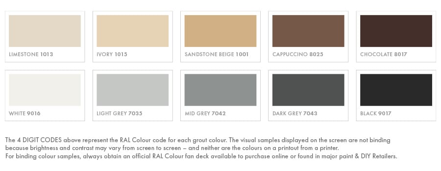 Now, you can colour your grout work with our range of stylish colours, as shown in our swatch set we’ve pre-selected a good range of 10 colours in popular tints.